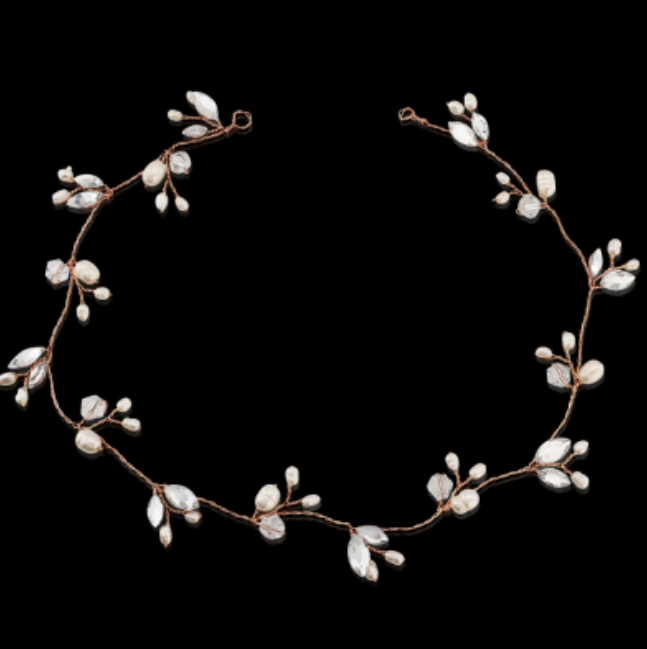 Elegante kristallen hair vine - met zoetwaterparels en hoge kwaliteit cz kristal op een rosé gouden finish. Lengte 33 cm. Makkelijk vast te zetten met speldjes.